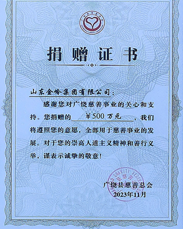 2023年11月29日下午,在廣饒縣樂安大廈召開廣饒縣慈善捐贈大會上,山東金嶺集團有限公司捐贈500萬元,并被評為“2020-2022年度廣饒慈善榜最具愛心企業(yè)”,縣長王學(xué)春、縣委書記陳偉頌對公司在慈善捐贈方面慷慨解囊給予高度評價,陳書記指出:“金嶺集團具有新時代民營企業(yè)強烈的社會責任感和大企業(yè)的擔當精神”。