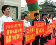 在6月1日廣饒縣開展的“慈心一日捐”活動中,公司董事長趙曰嶺個人向廣饒縣慈善總會捐款10萬元。近幾年來,在企業(yè)迅速發(fā)展的同時,趙總不忘回報社會,積極為地方經(jīng)濟發(fā)展和社會慈善事業(yè)捐款捐物,幫助附近村莊修路、打井,至今已累計捐款500多萬元,樹立了一個勇于承擔(dān)社會責(zé)任企業(yè)家的良好形象。圖為企業(yè)發(fā)展部趙曰森經(jīng)理代表趙董事長出席捐款儀式。