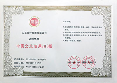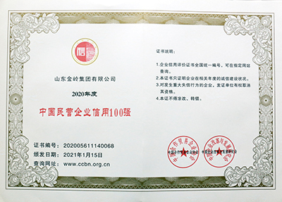 2021年1月16日,由中國合作貿(mào)易企業(yè)協(xié)會、中國企業(yè)改革與發(fā)展研究會主辦的“2021中國企業(yè)信用發(fā)展論壇暨第十二屆誠信公益盛典”在北京隆重召開。在會上,金嶺集團獲評“中國AAA級信用企業(yè)”,總裁趙棟獲評“全國優(yōu)秀誠信企業(yè)家”。會議還發(fā)布了2020年度中國企業(yè)信用500強系列榜單,金嶺集團成功入圍“中國企業(yè)信用500強”、“中國制造業(yè)企業(yè)信用100強”、“中國民營企業(yè)信用100強”,受到大會表彰。多年來,金嶺集團始終高度重視企業(yè)誠信體系建設,不斷加強合同履約考核,提升了全體員工的誠信意識,營造了“守信光榮,失信可恥”的氛圍,樹立了良好的企業(yè)信用形象。