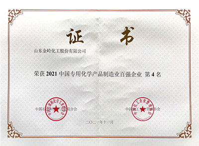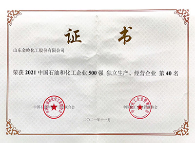 2021年11月29日,在中國(guó)石油和化學(xué)工業(yè)聯(lián)合會(huì)、中國(guó)化工企業(yè)管理協(xié)會(huì)聯(lián)合舉辦的“2021中國(guó)石油和化工企業(yè)500強(qiáng)發(fā)布會(huì)”上,山東金嶺化工股份有限公司榮獲“2021中國(guó)石油和化工企業(yè)500強(qiáng)獨(dú)立生產(chǎn)、經(jīng)營(yíng)企業(yè)”第40名、“2021中國(guó)專用化學(xué)產(chǎn)品制造業(yè)百?gòu)?qiáng)企業(yè)”第4名。