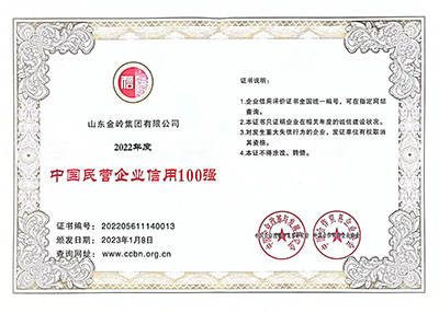 2023年1月8日,在中國企業(yè)改革與發(fā)展研究會、中國合作貿(mào)易企業(yè)協(xié)會主辦的“2023中國企業(yè)信用發(fā)展論壇暨第十四界誠信公益盛典”會議上,金嶺集團榮獲2022年度 “中國企業(yè)信用500強” 、“中國制造業(yè)企業(yè)信用100強”、“中國民營企業(yè)信用100強”、“培育誠信經(jīng)營、守信踐諾標桿企業(yè)”榮譽稱號。多年來,公司始終高度重視企業(yè)誠信體系建設(shè)、加強合同履約考核,提升全體員工誠信意識,樹立了良好的企業(yè)信用形象。