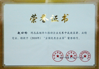 5月23日至24日,2010年全國企業(yè)家活動日暨中國企業(yè)家年會在湖南長沙舉行,會議揭曉我國企業(yè)界最高獎項(xiàng)——“全國優(yōu)秀企業(yè)家”獎并舉行表彰儀式,公司董事長趙曰嶺榮獲“全國優(yōu)秀企業(yè)家”稱號?! ?/DIV>