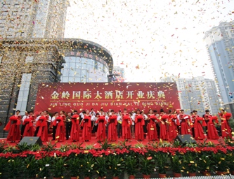 日,金嶺國(guó)際大酒店廣場(chǎng)彩旗招展,鑼鼓喧天,花團(tuán)錦簇,熱鬧非凡。